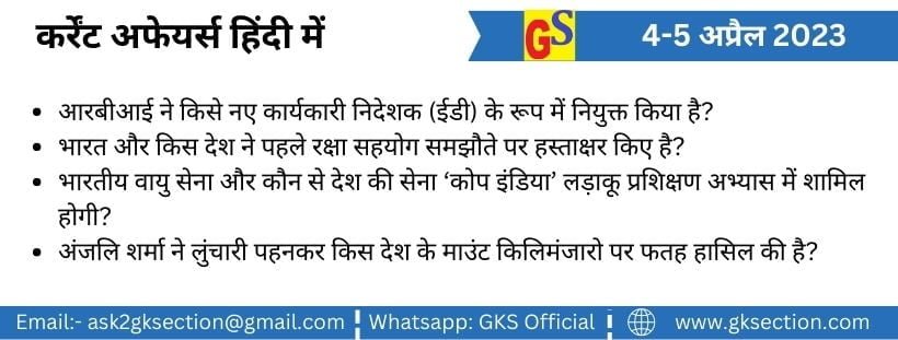 Current Affairs in Hindi – 4-5 अप्रैल 2023 General Knowledge in Hindi